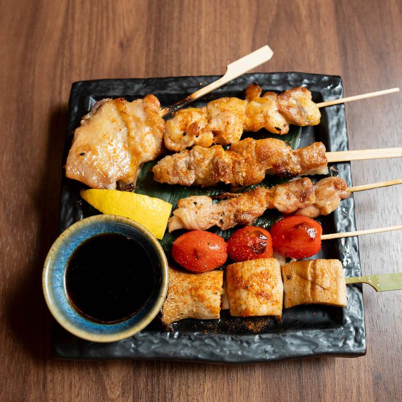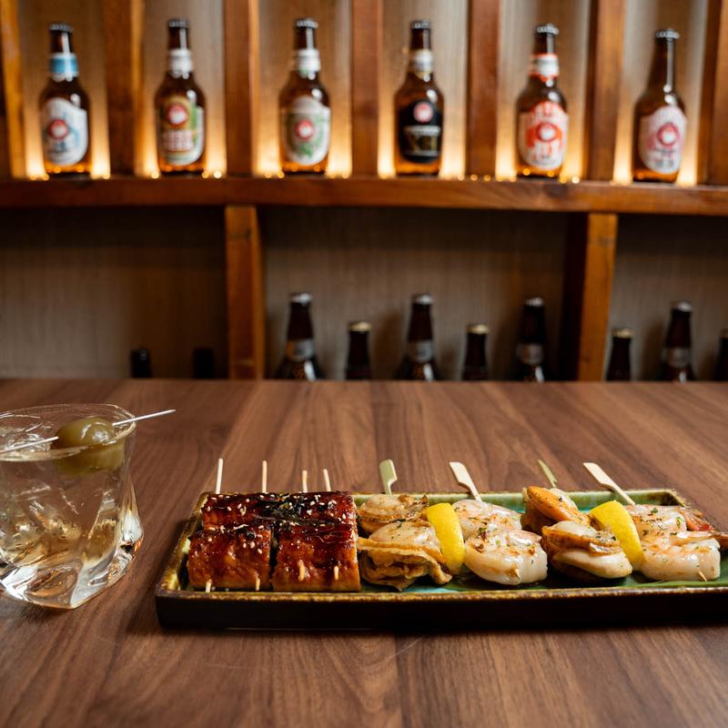 Giant scallops, tiger prawn, unagi, miso beef (2 pcs), momo (2 pcs), eringi mushroom, and zucchini.