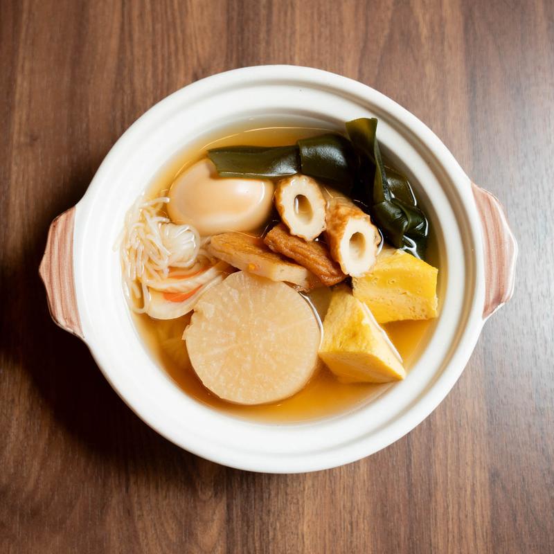 Egg, daikon, kombu, fried tofu, and shirataki.
